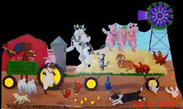 Of all the entries thus far, this one was the most involved. Determined to win first place this year I went all out. Not only are pieces layered to give the mural depth but several actually move. Turn the big tractor wheel and the sheep jumps up and down (Got to get those beads!). The balls, the cat is juggling, spin; and the duck jumps up and down when the rear trailer wheel is turned. And last, but certainly not least, the pigs do a high kick when the windmill blade turns. Look closely and you’ll see the indignant peacock staring down the hens who stole his tail feathers. By the way, it did win first place. |
